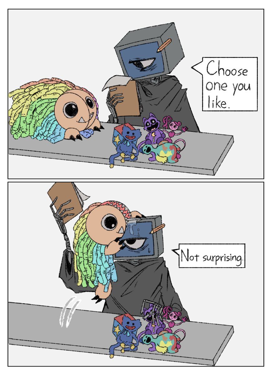 >>733413964See I can imagine Mommy's arm helping him since it can actually stretch but the others are of no help. Catnap's hide should've been his means of spewing out the red smoke instead of him just having canisters of it that he can use any time.Should've looked something like this. The whole "he's gonna make me part of him" thing could've been done way better.