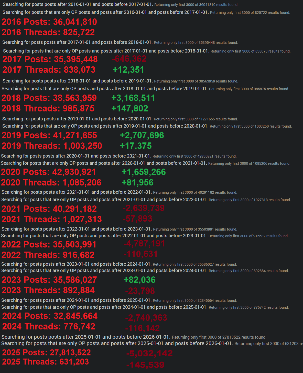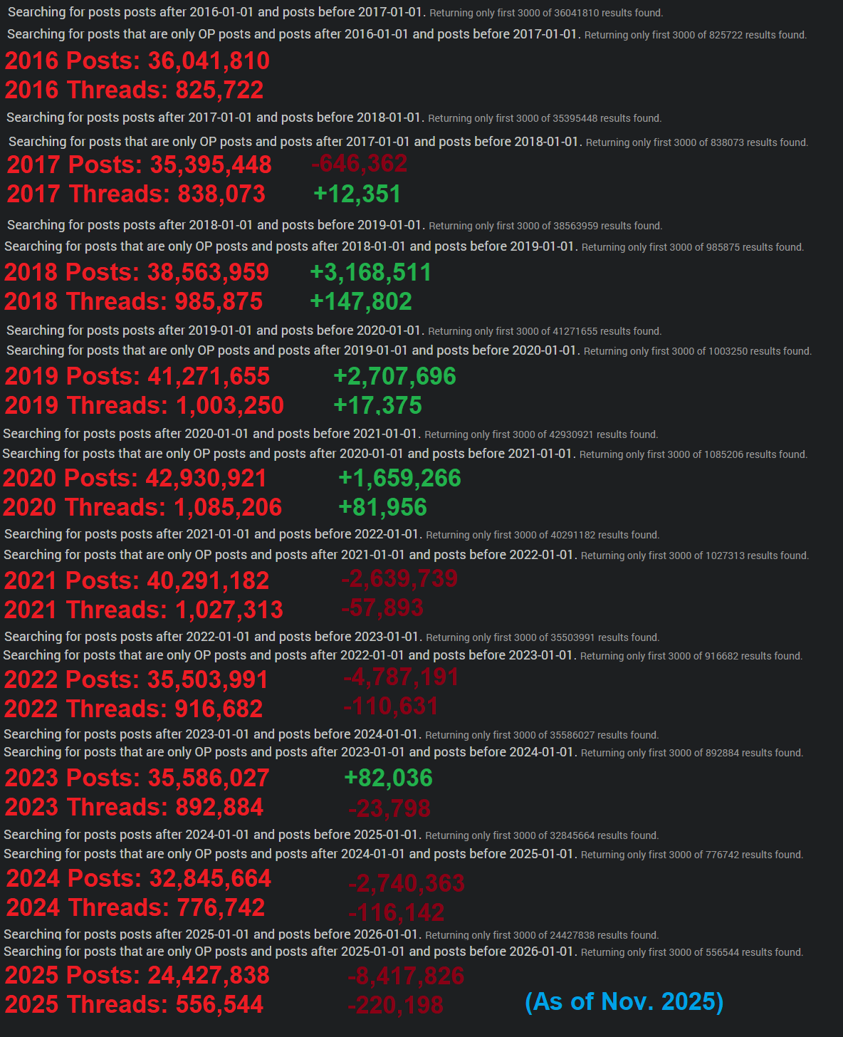 >>733472271Forgot to update this one. By the way, for a current look at the start of things, here's January on /a/ and /v/.>January 2025 on /a/1,020,890 posts>January 2026 on /a/779,351 posts, which is the lowest ever January in recorded /a/ history, below Jan 2009's 909,520 posts. >January 2025 on /v/2,625,810 posts>January 2026 on /v/2,038,814 posts, a loss of over 600K between years. Though I don't think /v/ will ever drop below about 15~18 million posts. I think that's its lowest end./a/ though, we'll probably see that fall to sub-5 million before the end of the decade.
