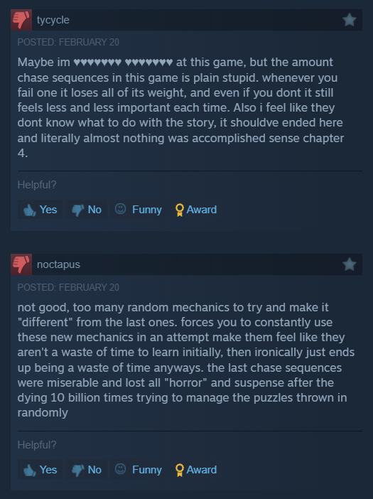I'm genuinely kind of confused on what people want from this game now. They're saying the puzzles don't work with the pacing and that chase sequences aren't good because they lose tension when you die. Like what DO you guys want from this game? Any fucking horror game loses tension after you die. Should they just make it so you can't die anymore?