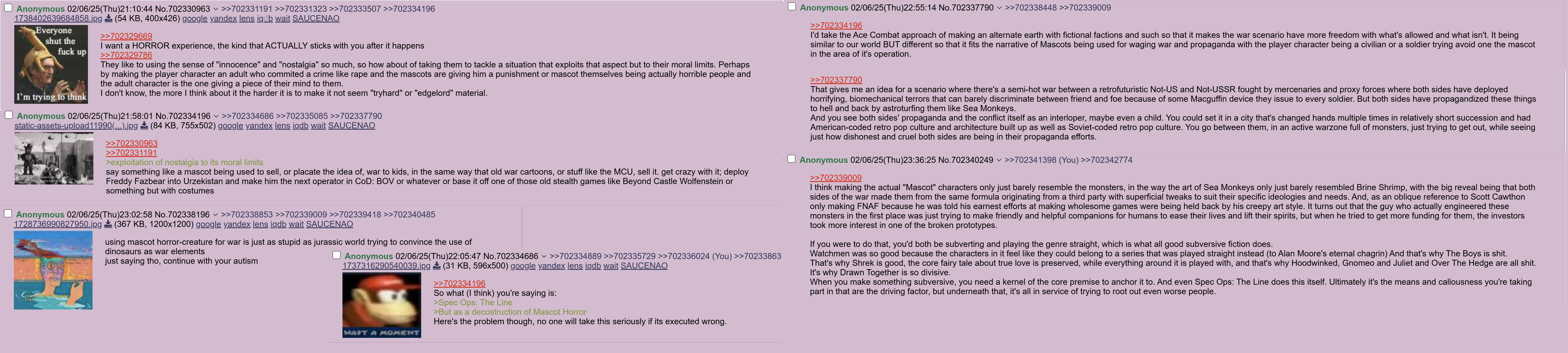 >>733541327And there’s so many toys you could take inspiration from for enemies and weapons instead of all the usual suspects Mob went with (Dolls, JITBs, ambiguous furry creatures)>Bakugan Droidekas/Dwarven Spheres>Clackers that can be used like Bolas to incapacitate pursuing or fleeing enemies>8-Ball grenades that are super cheap, at the cost of having a completely random effect when used
