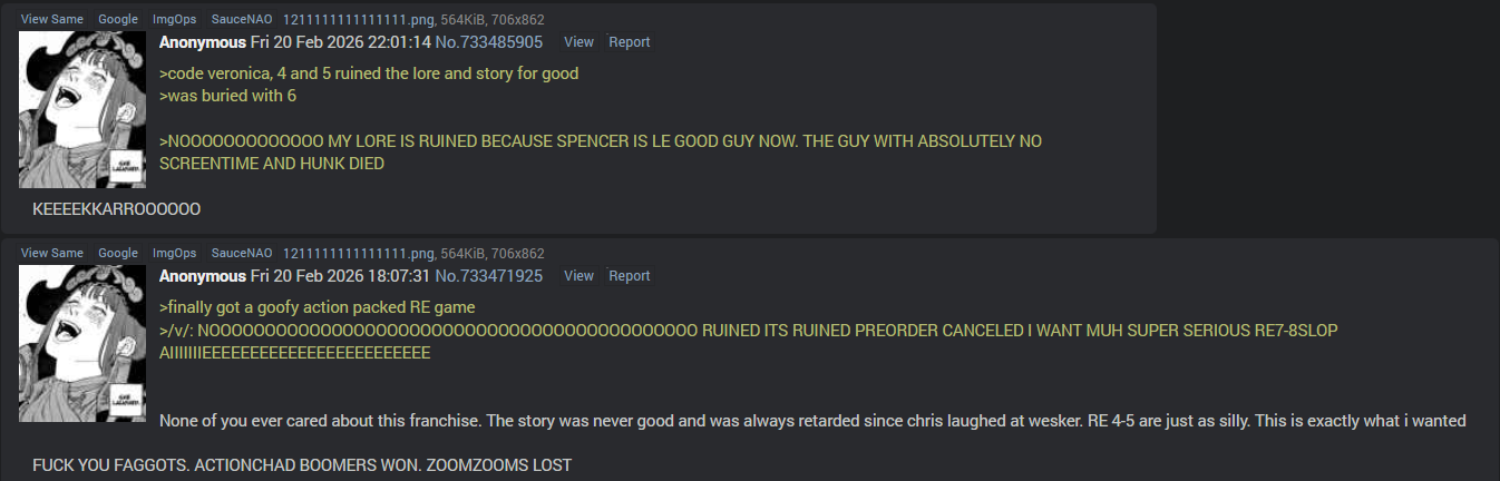 >>733489031>>Survivor can't happen because it's contradicted by the remake of 3Please elaborate. I'm not as knowledgeable as you. I kneel. >>Resident Evil 7 COULD happen... but Resident Evil 8's entire storyline is retconned by RE9's usage of Chris and the BSAA, so now RE7 itself is in question due to how connected it isSo... how many timelines are there?- OG timeline: 0, 1, 2, 3, 4, 5, 6, 7, 8.- RE engine demake timeline: 2, 3, 4, Infinite Darkness, 9.
