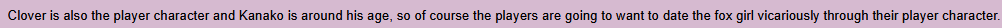 >>733548123>Nobody (well mostly nobody, as I mentioned before lolicons do exist) wants to fuck child Kanako.Well that's what that other post (>>733546102) seemed to be saying, what with "Clover is also the player character and Kanako is around his age, so of course the players are going to want to date the fox girl vicariously through their player character.". If that's not what the rest of that KanaClover/KanaCole/whatfuckingever shit is, that still seems a bit iffy to me, but whatever, but whatever the fuck that other guy was talking about doesn't seem right.