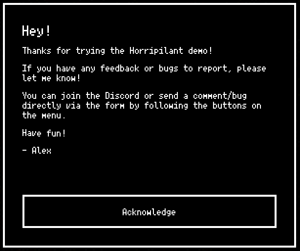 >>733553287Is this high quality demos, or demos for high quality games?Because the Big Hollow 1982 demo is not really "high quality", its too short. Its 2 puzzles long, and they are tutorial puzzles.
