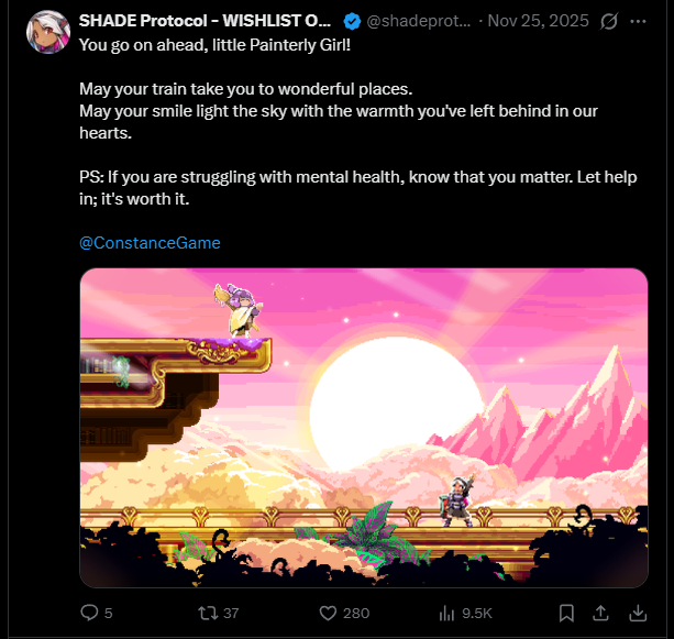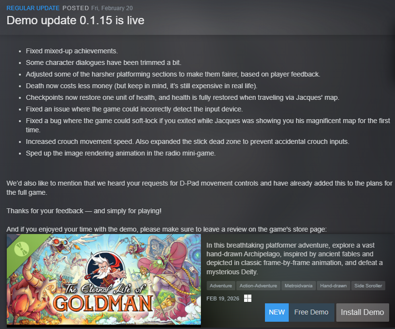 This demo was a strong positive surprise for me, ENTER Valerie.https://store.steampowered.com/app/3568960/Valerie/I was expecting a boring walking sim with a female coded-story, but I got instead a decent platformer with secrets, satisfying physics, good atmosphere and interesting setting that got me curious about the story and future gameplay both. Such a great palate cleanser especially put against the eternal kike Goldman game. This game meanwhile already had a stronger hook both in gameplay and plot with much less dialogue or filler. That said, the area was a little too big to explore and lacked a real challenge to tackle, to add on that the wall climbing/running seems to trivialize level design. I guess the description did say it was a kind spirited game. The tutorial segments were more challenging than the game proper.Still the main character is a cutie, both as a kid and as a teenager/young adult. Wishlisted, I hope this succeeds.