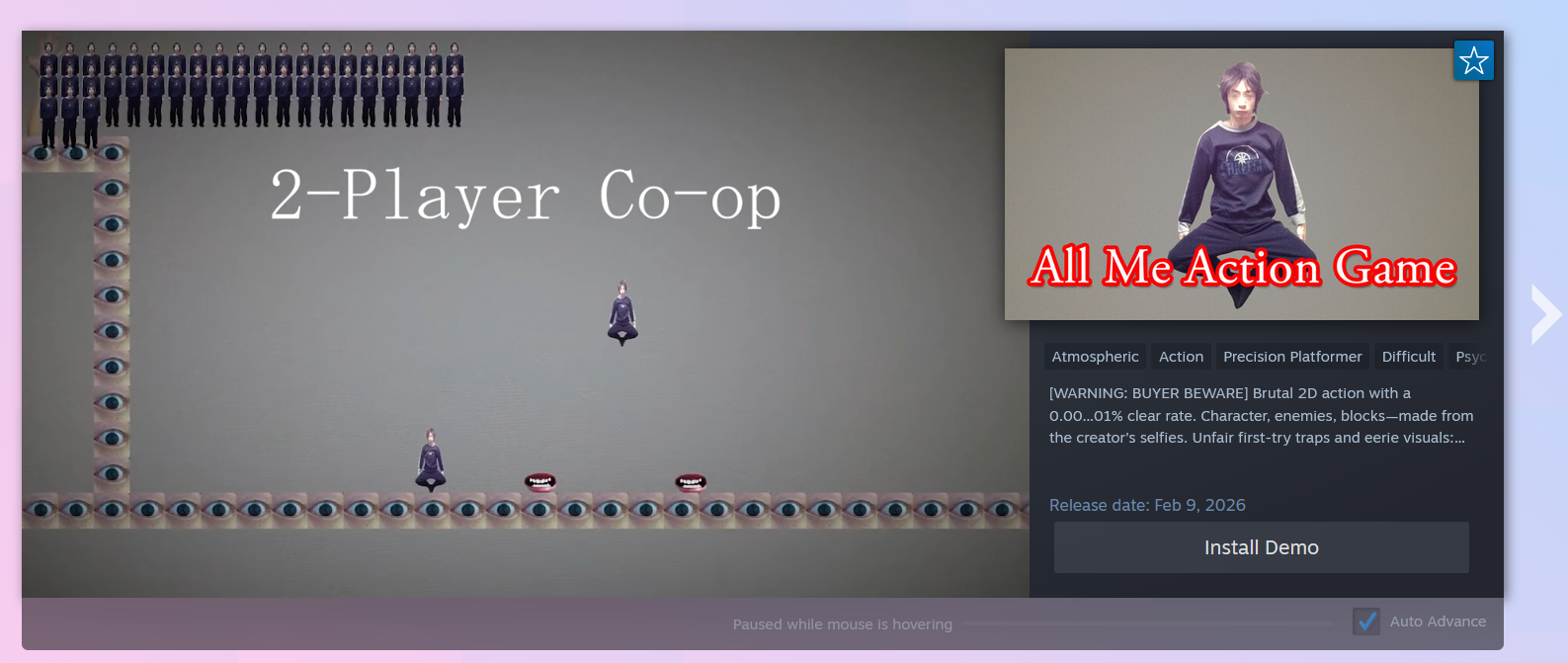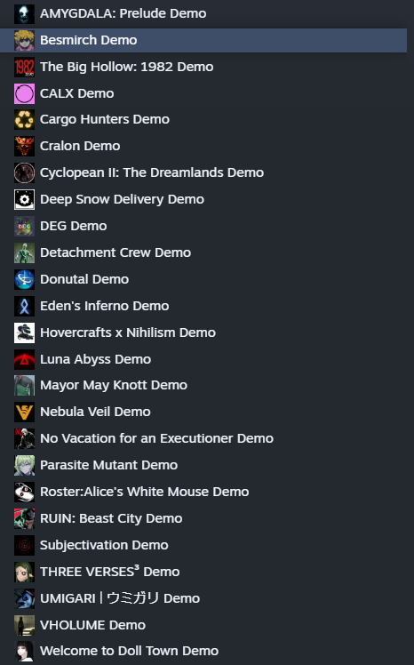 >>733664404My top 5 so far are:https://store.steampowered.com/app/1971670/Panic_Floor/https://store.steampowered.com/app/3568960/Valerie/https://store.steampowered.com/app/3818000/Guns_and_Nuns_Storming_Hell/https://store.steampowered.com/app/2090390/Schrdingers_Call/https://store.steampowered.com/app/4380660/Prolegomena_To_a_Hyperdimensional_Interface_That_Will_Be_Able_to_Manifest_From_ThreeMinute_Interchanges_Experimental_Demo/I still have more demos to try