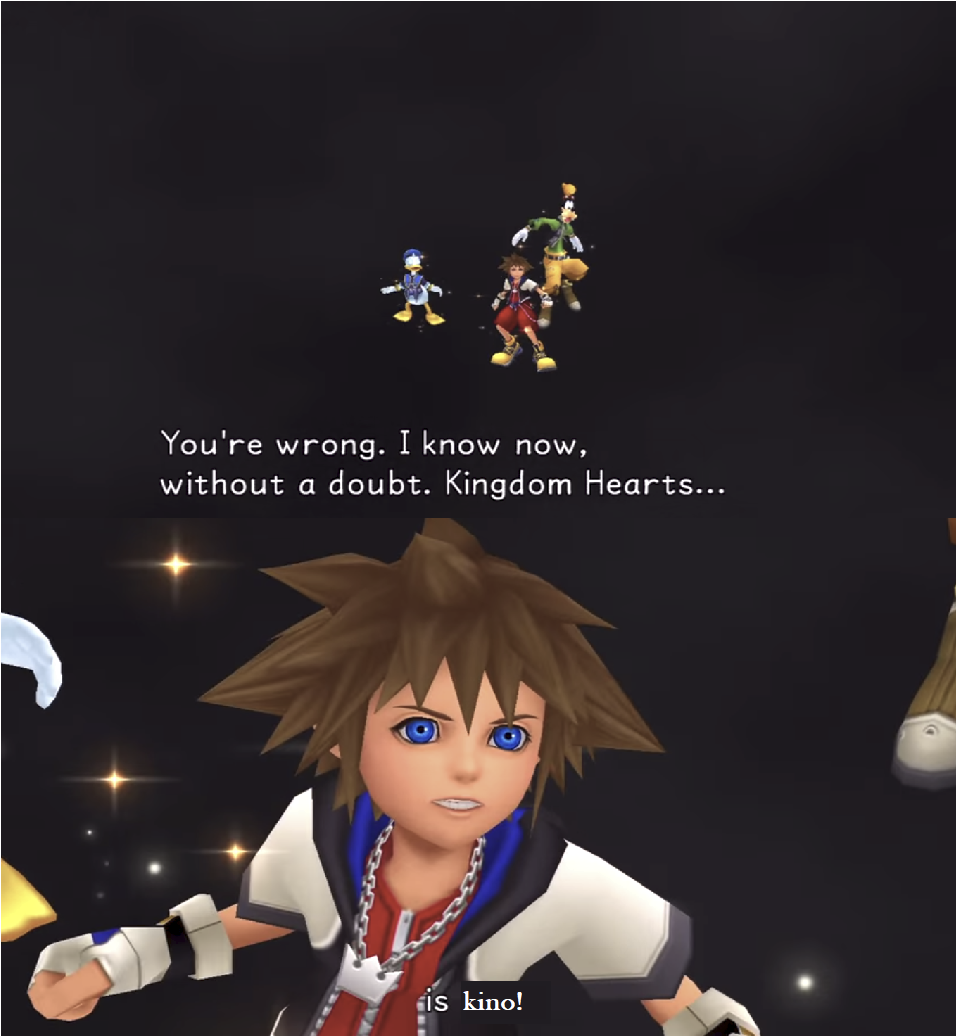 >>733583638The original Kingdom Hearts game.>no idea what's going on in Destiny Islands>everyone was asking me personality quizzes, but now they act like nothing happened at all>see Disney on the cover, but no Disney characters>Riku wants to cover the world in darkness?!>Now a guy with a fireball-spamming sword is trying to kill me?!>Hey, it's Aerith, Yuffie, and Cid from the cultural phenomenon video game: Final Fantasy VII!>Everyone here is from a fallen world.....>Oh, look! It's Donald and Goofy! Even Merlin and Jiminy Cricket!>Holy smokes, those shadow creatures have formed a suit of armour that I have to fight with basic sword skills!>Maleficent and a cabal of Disney villains are trying to conquer the Disney and Final Fantasy universes?! You need me to pilot a spaceship and bring balance to the forces of Light and Darkness?! Jiminy wants me to find the notes of an ancient scientist responsible for this whole mess and uncover the truth?!>What can I say but OHMYGOSHTHISISSOAWESOME!!!