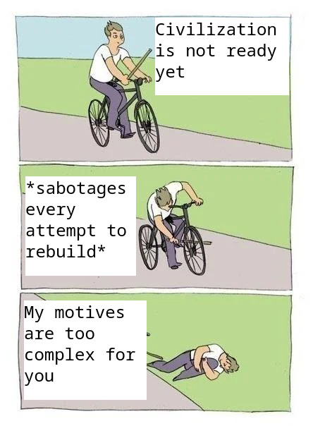 >>733635509>. but have no actual goal They do have a goal you idiot.Their goal is to advance science while remaining in their underground bunker because they see the surface as a lost cause, and think everyone is going to die out.