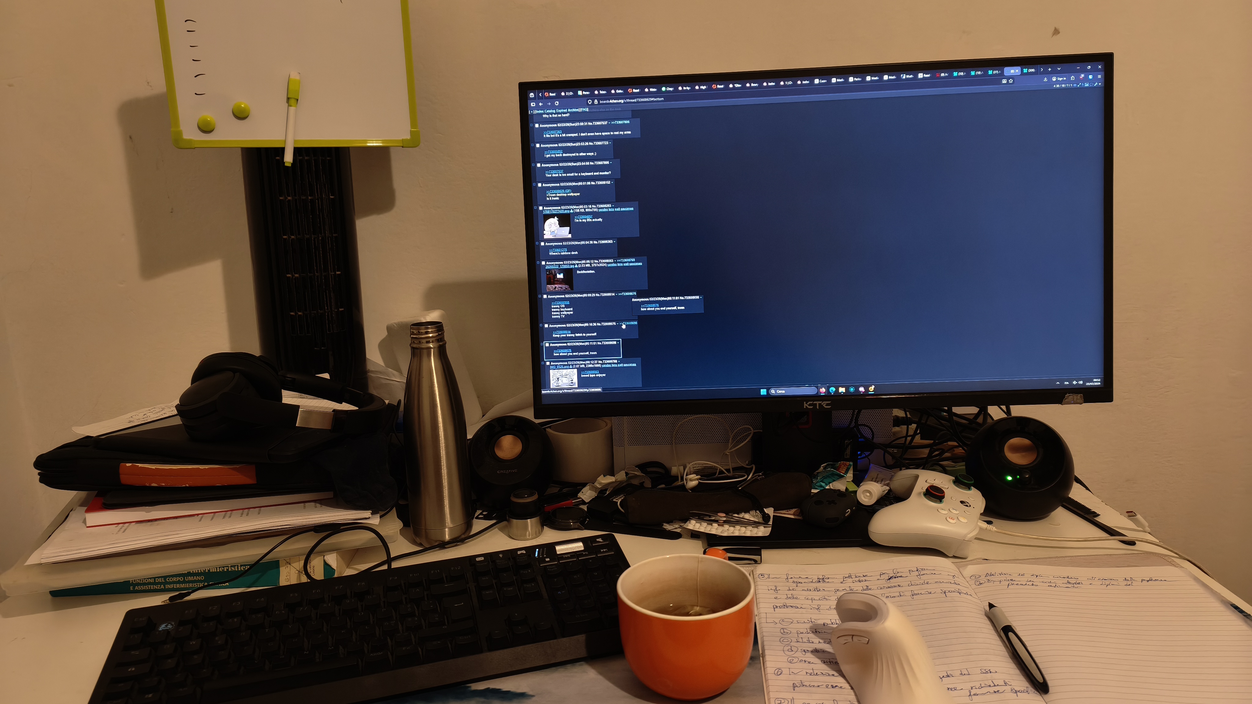 >>733607051First, put screen on wallAfter that, if you are not afraid damaging the desk, you can do some DIY work, like remove some cabinets to make space for the PC, get some Drill Crown and make holes to make holes for better cable managment, etc...