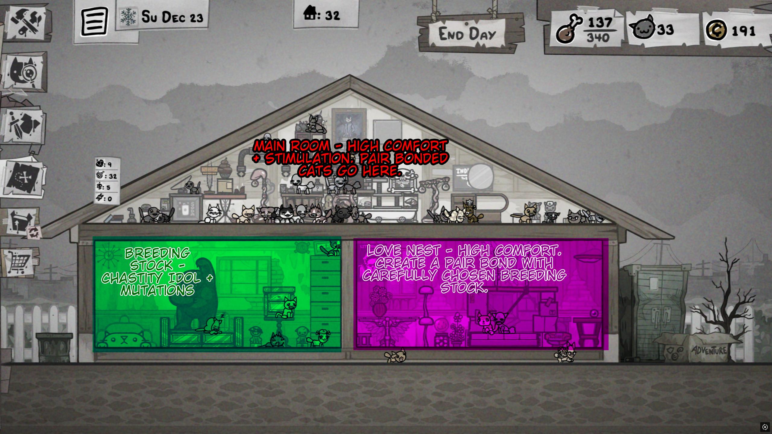 What am I doing wrong with breeding? From the guides I saw you need to have two cats in a high stimulation room with distinct 7 stats and wait until they produce a kitten that has all 7s from parents. I'm doing this but the problem is that this kitten never shows up, the parents never have sex even if they are both straight high libido of opposing genders. Eventually they die of old age without ever producing a kitten. What can I do in this situation to avoid this?