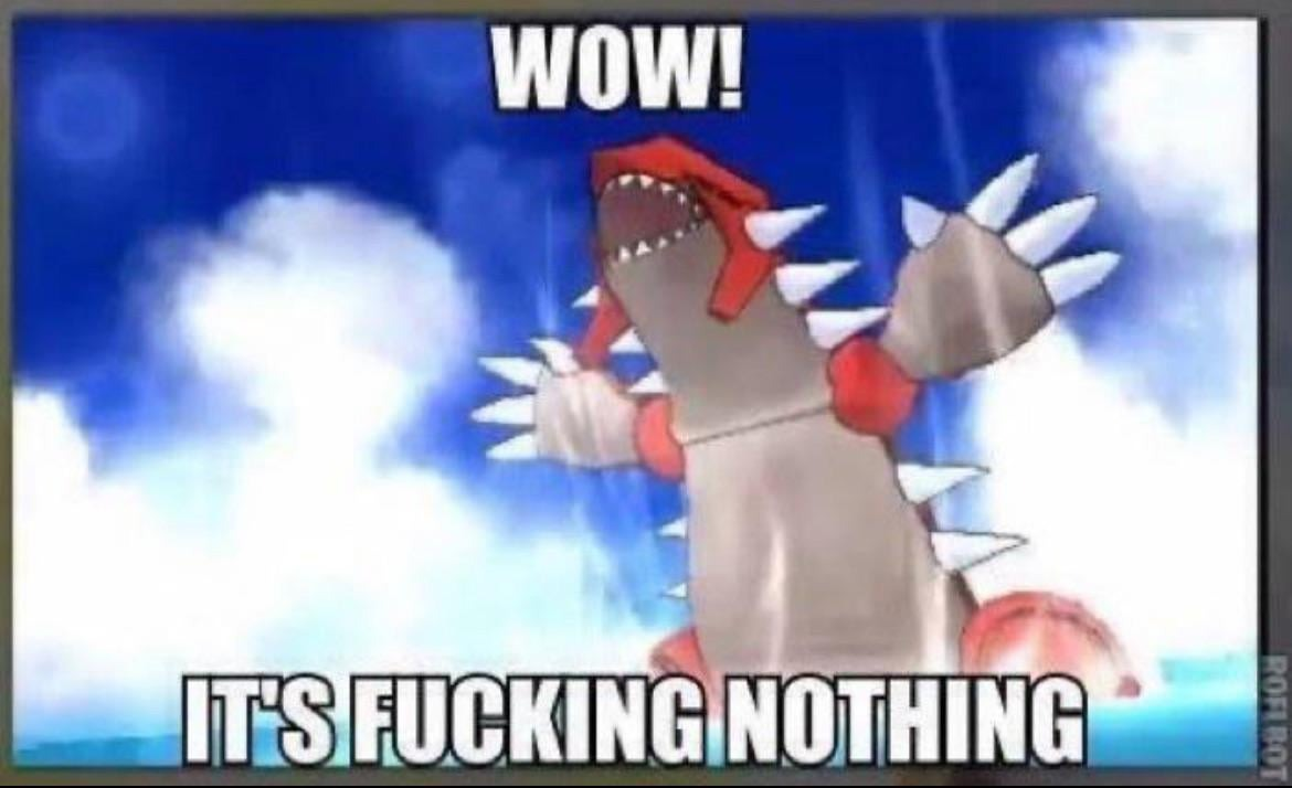 >>733614241>Rayquaza has fug (wholly organic)>Groudon took WOW IT'S FUCKING NOTHING for itself>Kyogre never got anythingWhy did the big whale never get its own meme?