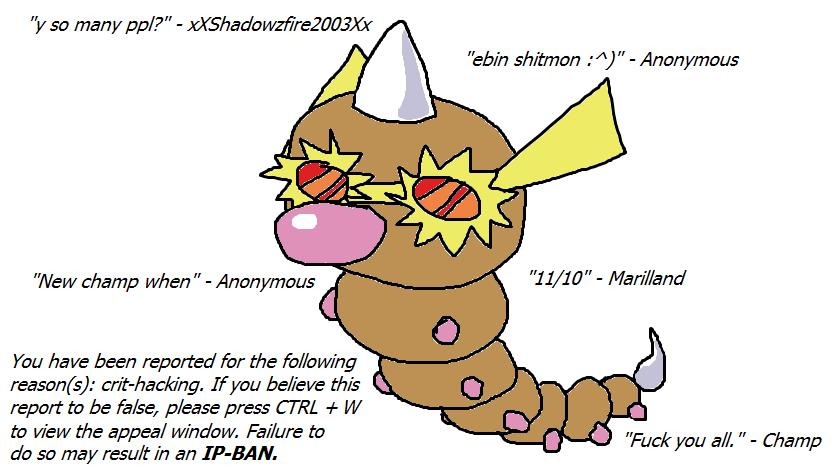 >>733626129Chump change compared to>Funbro (rip)>Arceus-steel/flying (rip)>Snips>Specs weedle>Donnel>Boom boom>Hot monkay dikThose were the days