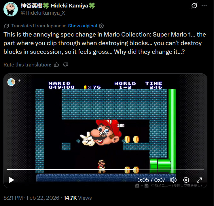 [Sad News] Hideki Kamiya trashes Super Mario All-Stars Super Mario Bros 1 Remake