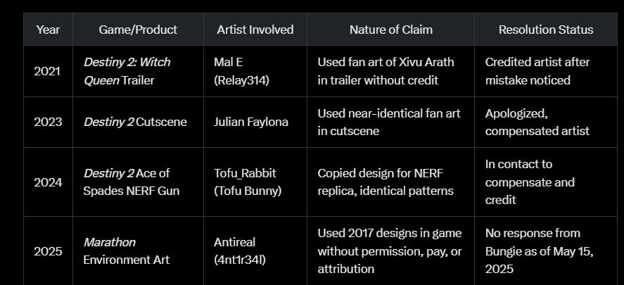 >>733665417>That's the most damning part of all this, imo.Oh, and I guess another daming part is that this isn't Bungie's first rodeo either. It is very customary of them to steal artist's work. It's truly amazing that Antireal actually got paid this time, no matter how small it was. Usually Bungie says they pay the people they stole from, but then they don't.