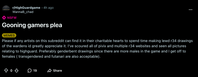 >>733636013>she's kinda hot>man face>huge ass jaw>small ass tittiesYeah I'm thinking you're a faggot.>>733634705No the game was DOA and doomed from the jump. I get why the retards are still pushing Marathon because they've probably already sinked hundreds of millions of dollars into it so at this point they're just huffing hopium that the game isn't a fuck huge flop (spoiler: it's a fuck huge slop flop) but smaller games like Highguard really should see the writing on the wall. You're honestly better off just saying fuck it and just shutting everything down and taking the L on the chin by cancelling the game vs being a laughingstock and then being apart of one of those sad ass "everyone was laid off and the studio was slammed closed" type of articles/posts. I know it's moreso not on the devs but the higher ups, but surely they see all these games failing, flopping, cancelling, and shutting down early right? The writing is literally right there and yet they keep making these dog shit fucking games why? They're just burning money and resources. Reminds me of another game I saw over the summer, where it was like some online co-op slop fantasy shooter game, honestly the game was so shit that I can't even remember the name but it's just another in the sea of flops. I don't get why these people won't just fuck off with these types of games.