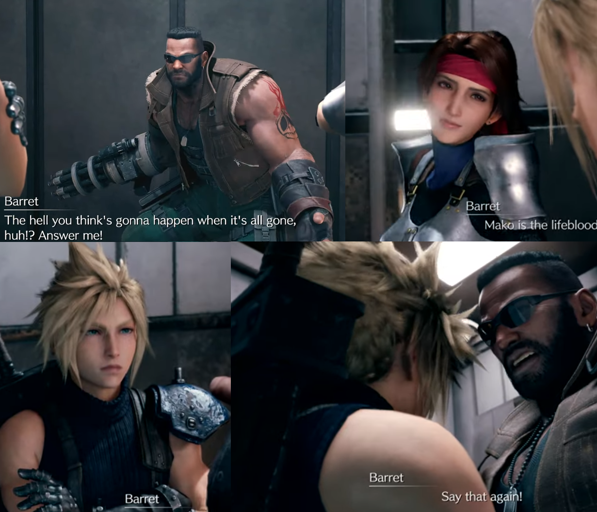 >>733640793>you can analyze details in the original because the artists put those details there>he literally does the "bravo vince" meme kekanon heres another, better explanationthe scene is framed that way because 1. they wanted to do the "barret turns around and seethes alone" scene but cant make it a cutscene so they decided to frame it so the player sees barret seethe.AsSimpleAs ThatAnd if you wanna be like that, the "scene" you mentioned is not a scene at all, it is literally just a random frame of the party getting in.The entire scene, composition, character dynamics and everything is done properly in a cutscene. Barret is passionate, Jessie doesnt 100% follow but she bears with it, Cloud doesnt care and they clash.