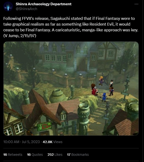 >>733644532>Sagakuchi stated that if Final Fantasy were to take graphical realism as far as something like Resident Evil, it would cease to be Final Fantasy.Judging from the success of Expedition 33, which has a highly detailed and photorealistic art style, he was completely wrong. The Remake team clearly didn't go far enough, because the game is still highly stylized, despite leaning strongly into realism.All said, you OG niggers need to stop living in the past. The Lego block anime shit that you praise to heaven has not been modern for almost 30 years now.