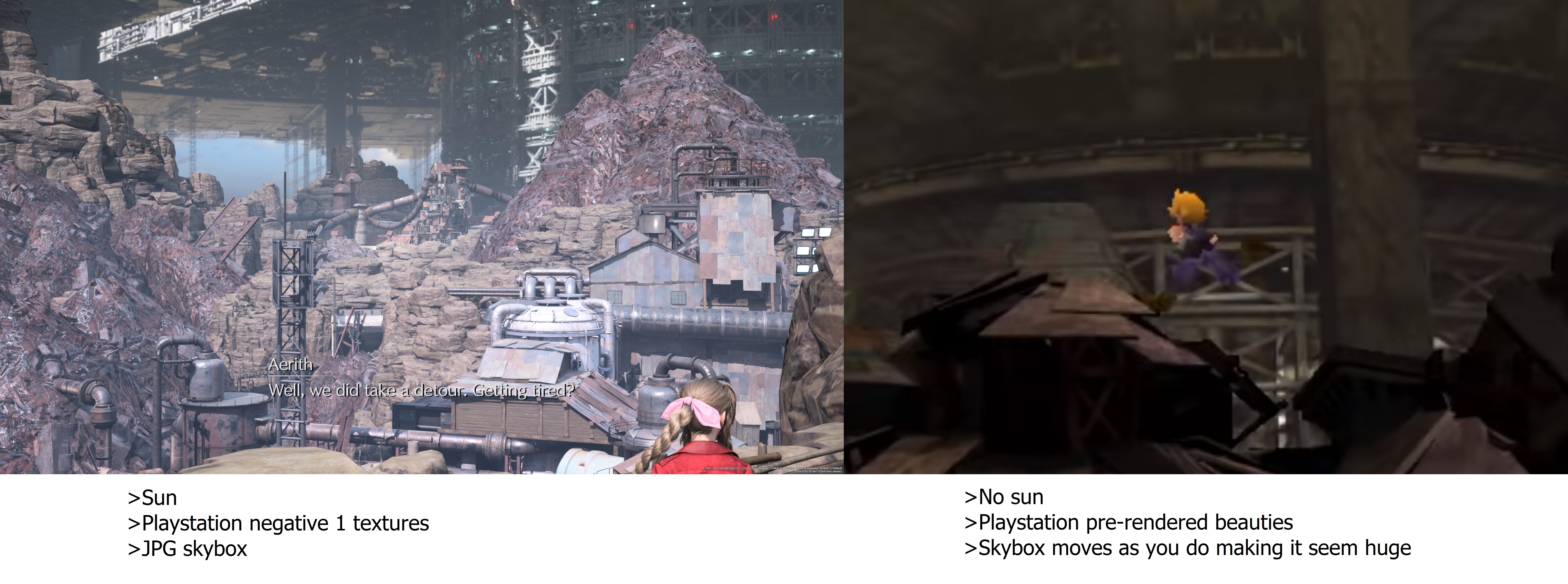 I still love Remake and Rebirth but there are a number of things I would have done different. I'll focus on lighting for now.They should have just stuck with the Midgar slums having all sunlight blocked out. The opportunity to make it look as close to the original as possible was there in the setting and lore, it didn't run into a Cyberpunk 2077 problem of being called Night City and trying to look cyberpunk, but it's still an open world game with a day/night cycle so it has to look shitty and sunny for a while. It could have just always been dark apart from Aerith's house and where the plates collapsed. Then after all that, there's no day/night cycle when it becomes open world in Rebirth anyway. But they still decide to keep Corel in the day time. There's your opportunity to have that region at night, have the Gold Saucer look lit up in the distance, differentiate this desert reason from Cosmo Canyon a little more which should have been at dusk.