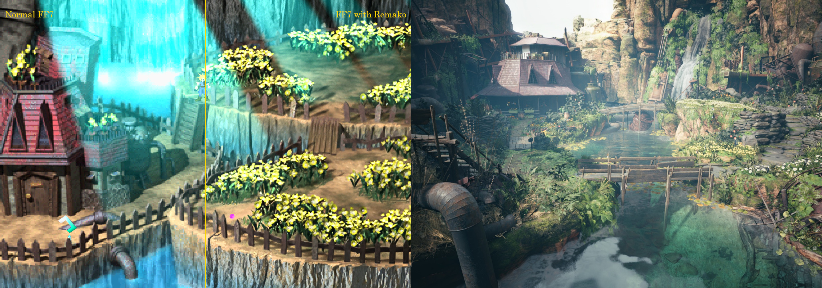 >>733665728>main point of the scene is the serenity of where aerith lives, with her flowers growing in abundance, in her clean garden>remake is random bullshit everywhere with a tiny little waterfall and nearly no flowersit's like they went into a lab to extract the final fantasy 7 from final fantasy 7 so they could throw it out.