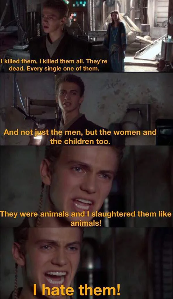 >>733665986>You would've understood and really sympathized with Anakin becoming Darth VaderThey don't want you to do this which is why they didn't go with your neonazi fantasy version of things