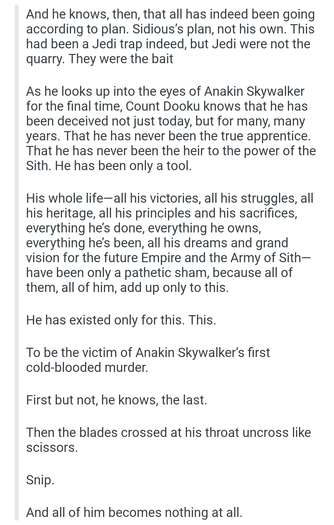 >>733645524>It is good that you have never wondered what lay beneath her robes. If her alabaster skin was as white and unblemished as her face. Or if perhaps she bore the scars of slavery… and if that would stir you more. If perhaps her deferent tone would change once you held her by the throat, and showed her how far a Jedi can fall.