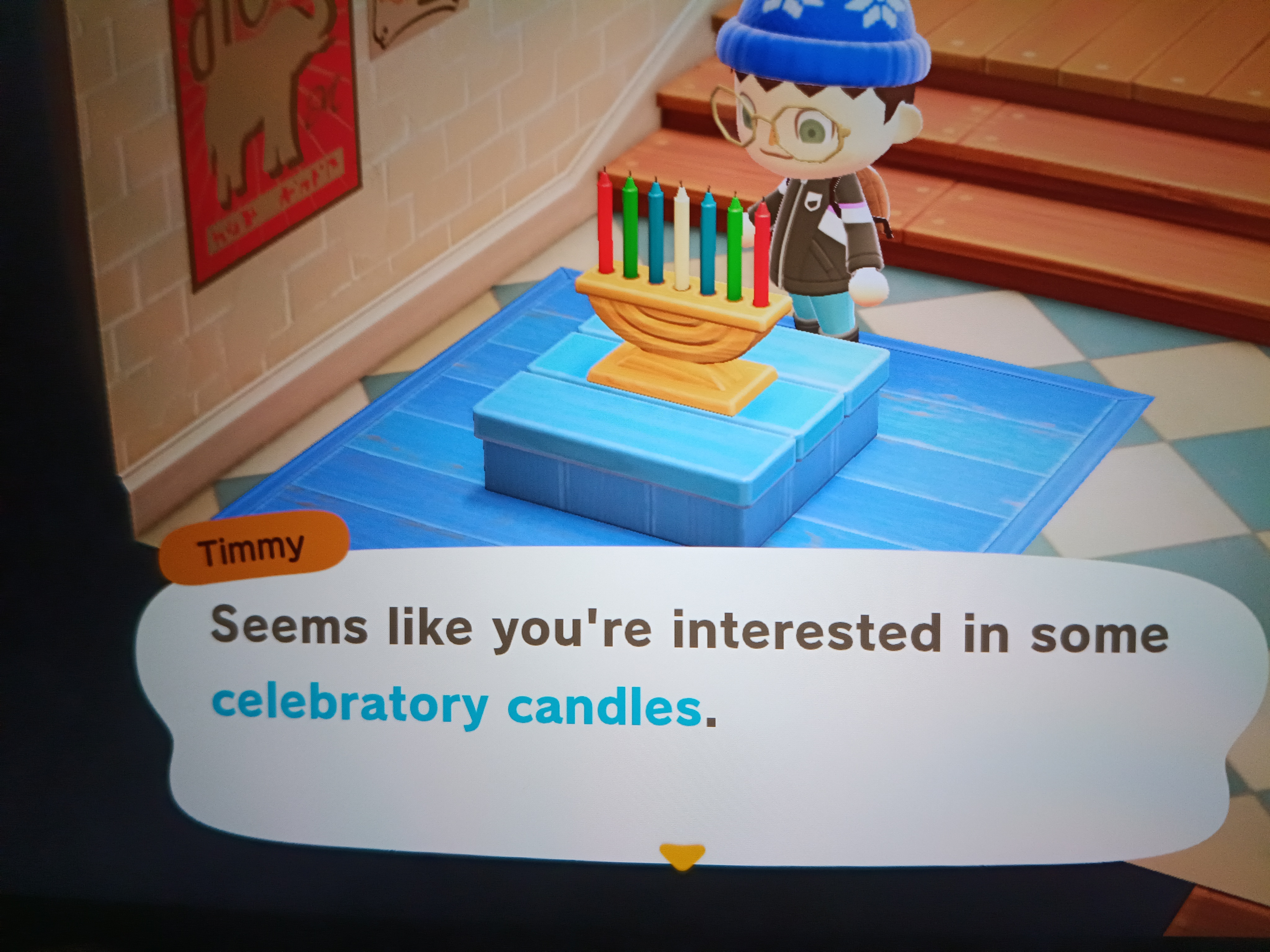 >The item resembles a kinara, used in observance of Kwanzaa, which occurs around the time the item is sold in-game>Prior to version 1.9.0, the HHA theme for the celebratory candles was Horror.