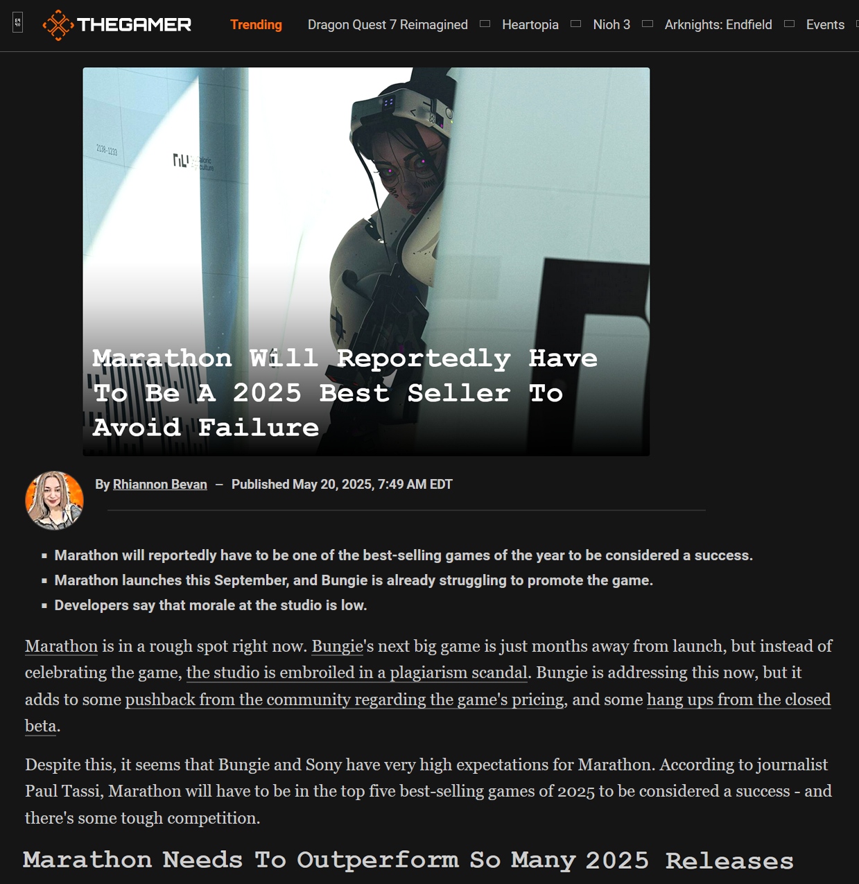 >>733650996>>733651032The funnies part is that right before Bungie was found to have stolen assets from a trans Twitter artist that the game dev follows on Twitter, there were constantly 8 simultaneous Marathon threads on /v/. Then the lolcow shitstorm happened and all the Marathon threads vanished. They seem to have returned, but their tone is almost sarcastic. It's so weird. Anyway, never forget that Marathon's entire visual identity, which is the *only* thing it has going for it, was quite literally stolen, as in copy and pasted, from a trans Twitter artist that the art director for Marathon follows on Twitter.