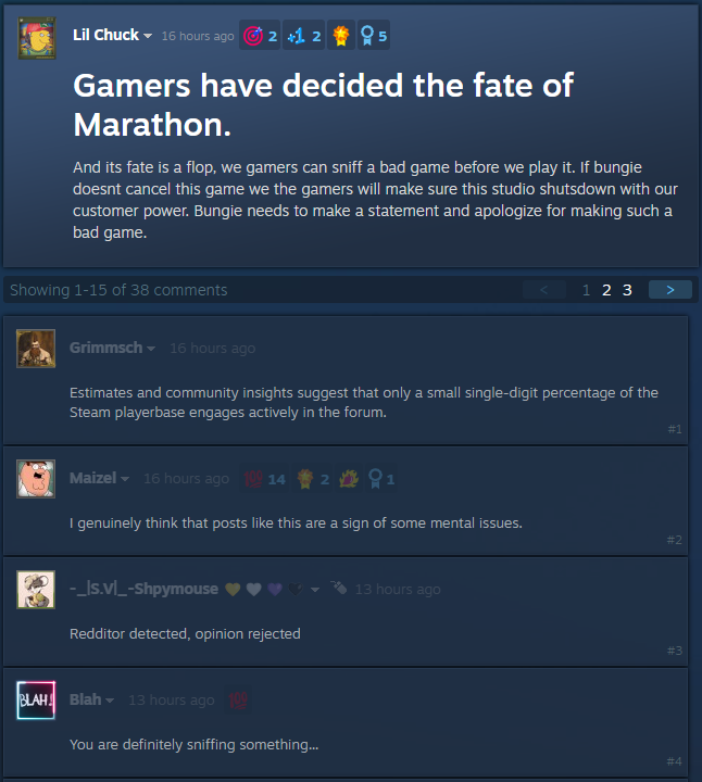 >>733683582'solved problem' just means the core type and gameplay loop are essentially in a final state where they won't ever change, kind of like deathmatch in FPS games. That's all.>>733683598>Bungie>competitive FPSThat was true in the Halo days only. Both Destiny 1 and 2 got big because of the PVE content, and the PVP was a neglected after thought. And Destiny 2 PVP has been dead for almost a year.>>733683724M8, you don't get into and stay in the top ten most played games on Steam by ignoring the casuals. You can piss and moan about Arc all you want, but its popularity is objectively observable, as was their pivot toward casual friendly shit with ABMM.>>733683728>it's popular everywhere, trust meNo, it's largely dead everywhere. Go look at the Steam forums for the game and tell me if that looks like a positive, healthy, excited bunch of players.