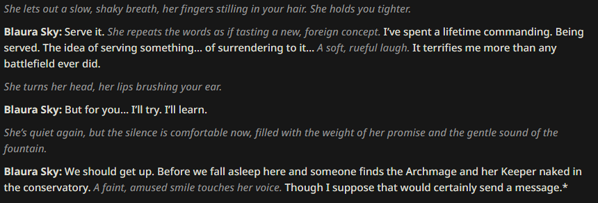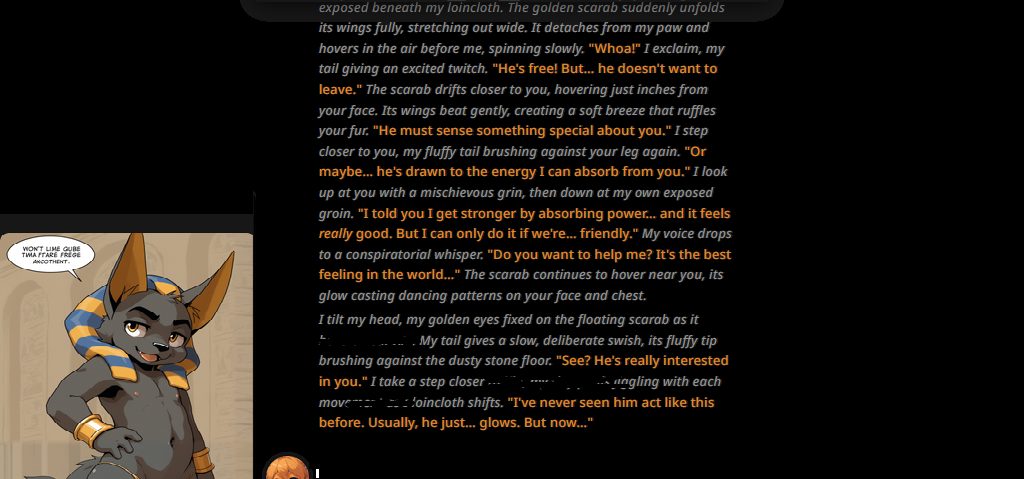 >>733656721EhI've tried setting up several bots, but i just don't have the energy or will to keep the conversation. Some times i do get a decent rp idea, but i find most of these bots boring. Maybe is because i'm a free shitter and the models and/or bots are low quality. But i have more fun just straight up writing the entire thing myself, be it as a caption or a fanfic.