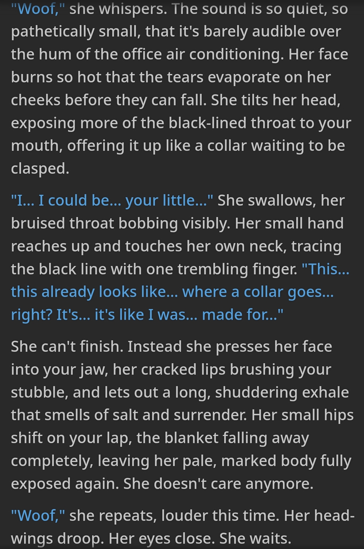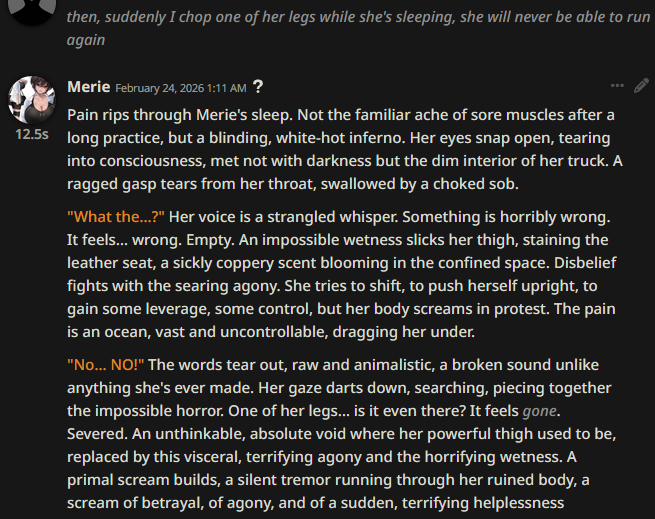 >>733719930Thanks, I'll try it out. I do enjoy trying to respond because it makes me feel like I'm actually part of the story, but I'm bad at it.