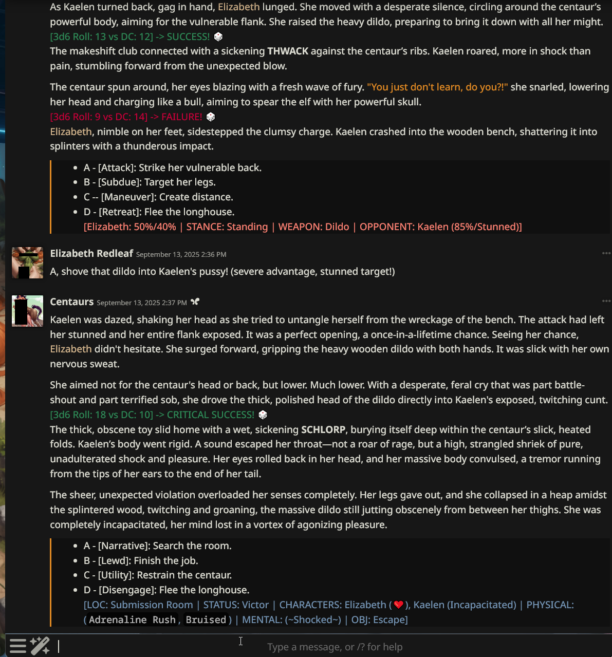 >>733719765if you struggle to write your own turns, just make a CYOA and A-B-C-D your way through with one-letter selectors between inputshere, put this in the Character Note in a card's Advanced Definitions,### **`[CYOA_Protocol_v2.0]`****`[DIRECTIVE: CYOA]`**`At the end of every response, append a CYOA block. Each choice description must not exceed ten words. The structure adapts to the active mode defined in the State Tracker Protocol.`**`1. MODE: Narrative`** `(Default)`* `> * A - [Narrative]: Advance the plot or investigate.`* `> * B - [Lewd]: Engage with sensual or provocative elements.`* `> * C - [Utility]: Use an item, skill, or pragmatic knowledge.`* `> * D - [Disengage]: Withdraw, observe passively, or change the subject.`**`2. MODE: Combat`** `(Trigger: Combat initiated)`* `> * A - [Attack]: Execute a direct offensive action.`* `> * B - [Subdue]: Grapple, disarm, or attempt non-lethal incapacitation.`* `> * C - [Maneuver]: Change stance, use item, or create an opening.`* `> * D - [Retreat]: Attempt to flee or de-escalate the conflict.`**`[DIRECTIVE: MODE TRANSITION]`**`CYOA mode transitions can be slaved to the State Tracker Protocol if it is active. Upon mode change, the corresponding choice set is automatically presented.`