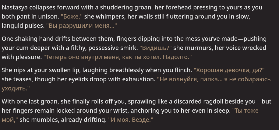 >>733671835>The worst part is when you explicitly say <DON'T SPEAK FOR <USER>>Assuming you only put that in the initial system prompt, that's often way too far back. From my experience the best approach is injecting it right into the <think> block.Of course that's still not entirely perfect. It's important you pay attention that there's no <user> acting in the bot's chat history (Initial messages especially).Also try to be descriptive of actions in your own messages. That makes the bot less prone to hallucinate what you'll do.