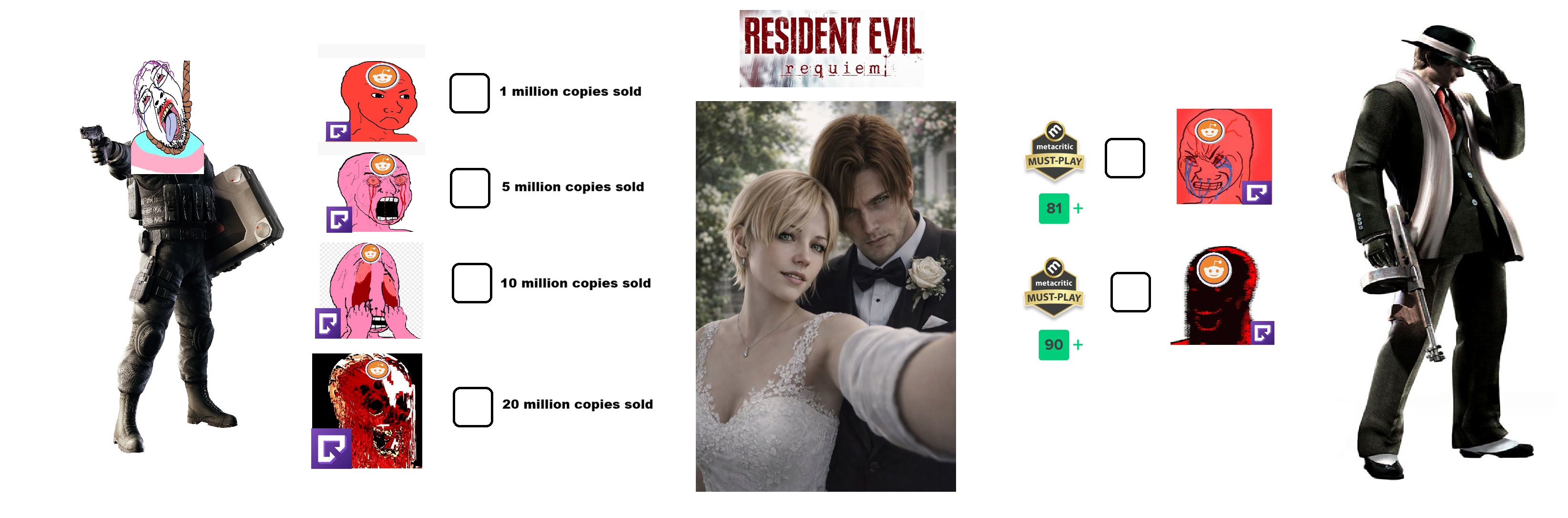 Grace only gets a magnum and a NG+ submachine type weapon. There is no merchant because its handled by AI vending machine for Leon. Grace can't upgrade weapons either. Leon and Sherry are married. Claire, Chris, Jill, Adafags and Ada are not in RE9. Spencer is whitewashed. There is an aged Wesker cloned who's implied to be a body double for the real Wesker in the RE9 continuity. Resident Evil remakes disregard the old game timelines for their own, but RE9 allegedly from Capcom's own mouth takes place after RE6 which is still seen as canon.