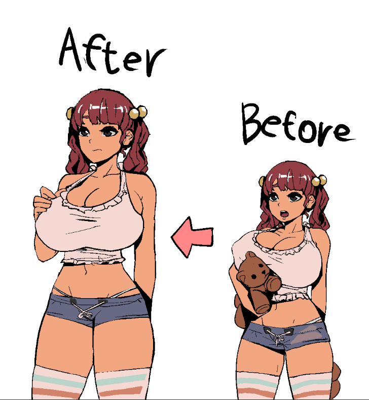 >>733660686Implies innocence which is further appealing in its juxtaposition both conceptually and visually with the size of her boobs. Note also the more innocent expression (eyebrows upturned in the centre).Right feels like a young girl that still plays with toys. Left feels like a generic late teens girl with no particular flavour besides being barely dressed. Entirely different appeal.