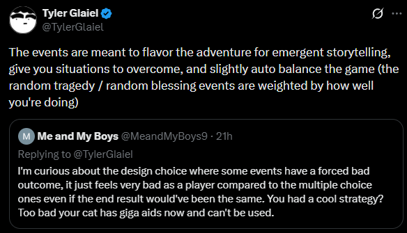 >>733681098>Edmund has said shit that wasn't true about the game already.How much has he said in recent interviews, though? It was like 4 days ago that he said your performance weights events.I could also imagine it being a system where events are seeded in advance but the odds can be tilted, meaning that you get a different result on the same seed - but we'd expect that to appear in testing.