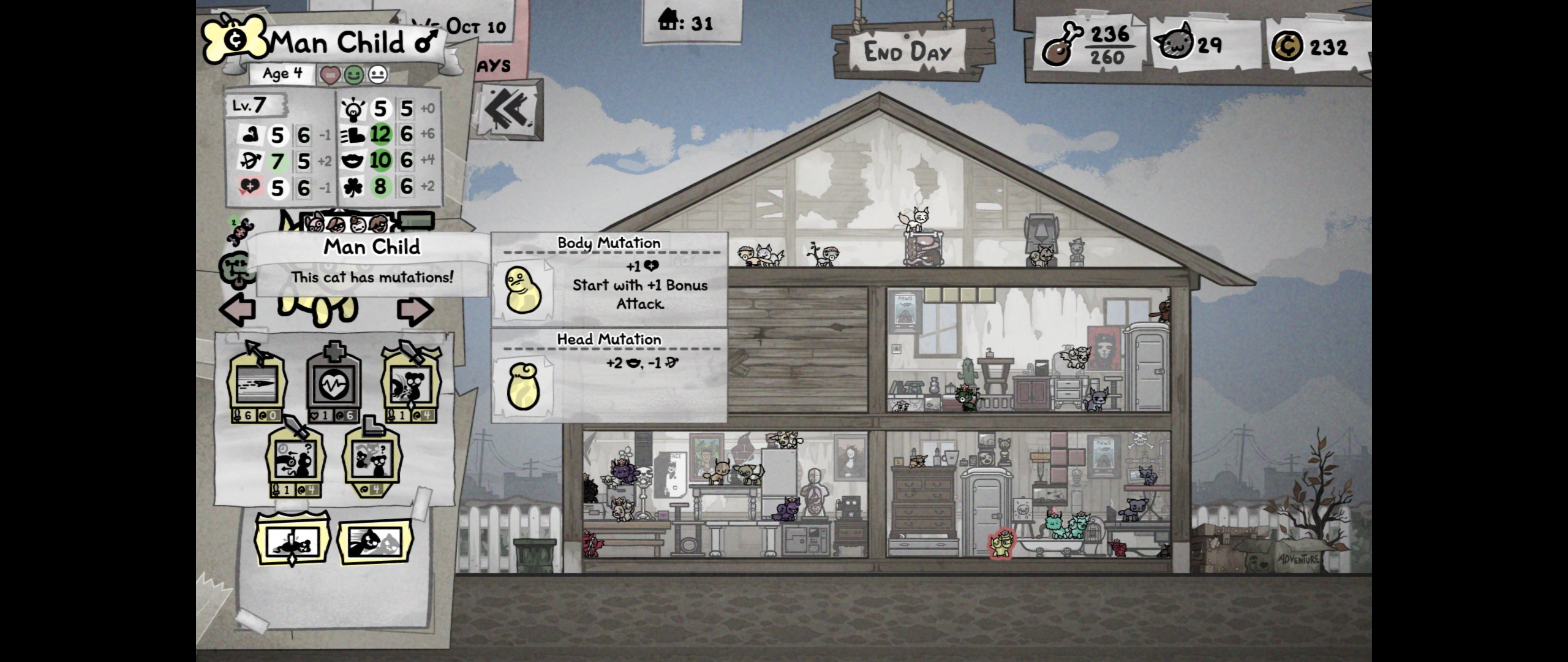 >>733679462>Rolling for Extra attackThrough the power of splitting male and female cats between rooms and dumping cats that get other mutations in the same slot I always have +1 attack on every cat on my team.