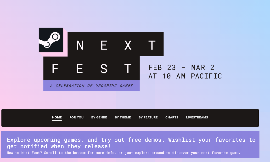 It's up. For real this time, EXIT game journos.https://store.steampowered.com/sale/nextfestExplore upcoming games, and try out free demos. Wishlist your favorites to get notified when they release!New to Next Fest? Scroll to the bottom for more info, or just explore around to discover your next favorite game.Previous thread:>>733553225
