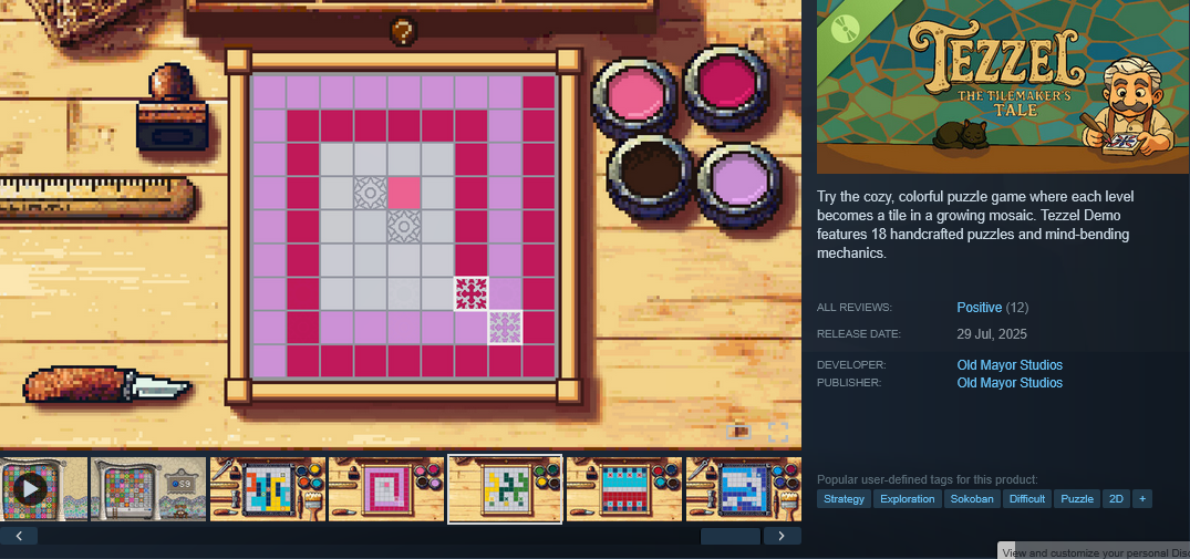 https://store.steampowered.com/app/3815270/Tezzel_The_Tilemakers_Tale_Demo/A fine sukoban. The gist of thing is that block can move over only their or neutral (white) color panels, but there are a lot of extra mechanism. There are blocks than paint panels when they move, ones that move until they're stopped by walls, sometimes blocks are connected and you have to move them both at once ect.
