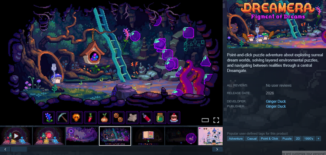 https://store.steampowered.com/app/4274830/Dreamera_Figment_of_Dreams/Pretty artstyle, some easy and some unclear puzzles and rather bad voice acting (even tho it's just one guy talking).