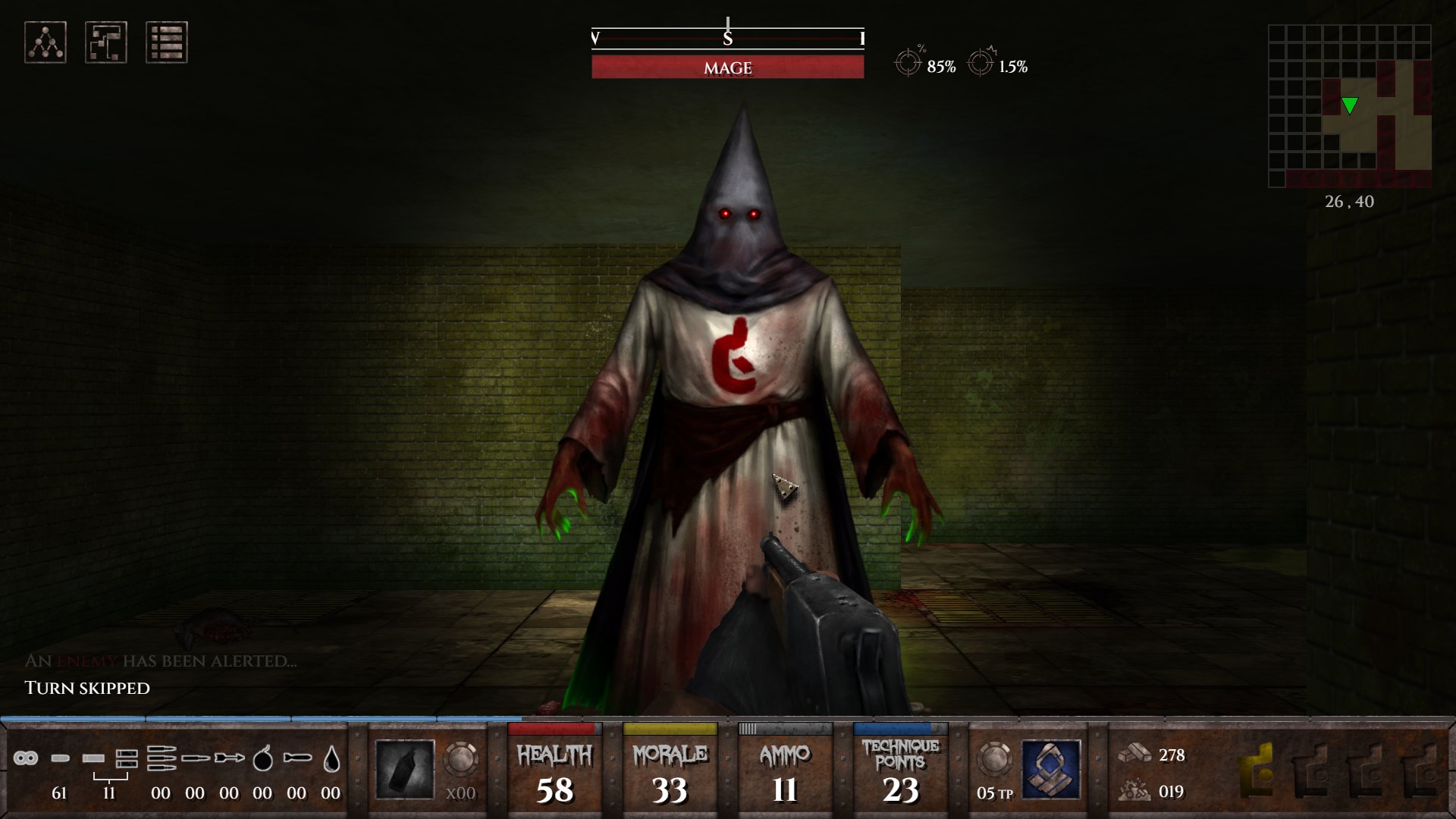 https://store.steampowered.com/app/2537470/Vultures__Scavengers_of_Death/"What if Resident Evil but turn based" basically. I've played only for like a half a hour but I can see potential. Pistol is the most useful in fighting zombies for obvious reasons but you get barely any ammo. You can do headshots that cost more AP but do more damage or aim at the legs for a chance to immobilize zombie for a turn. Get pretty heat up when you stumble on a cluster of zombies.
