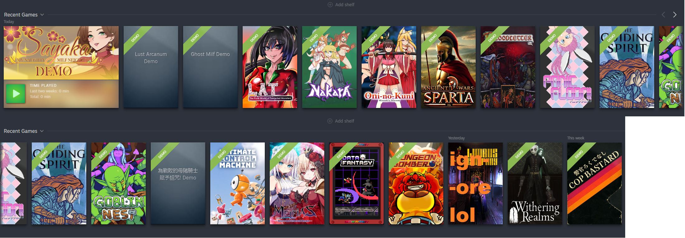 Any good incrementals?https://store.steampowered.com/app/4078200/Dwarf_Eats_Mountain/https://store.steampowered.com/app/3972320/Loot_Loop/