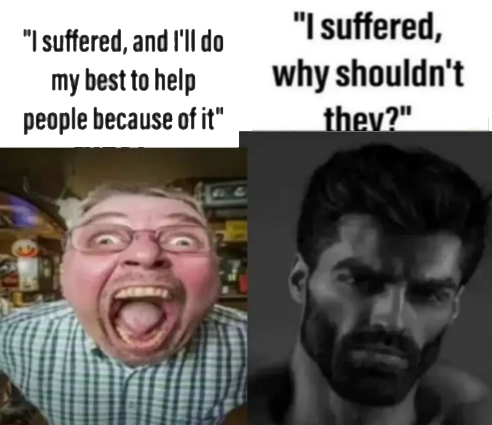 >>733672139Evil people use their suffering as an excuse for their bad behavior. Good people will try to protect others from experiencing the suffering they had to go through.