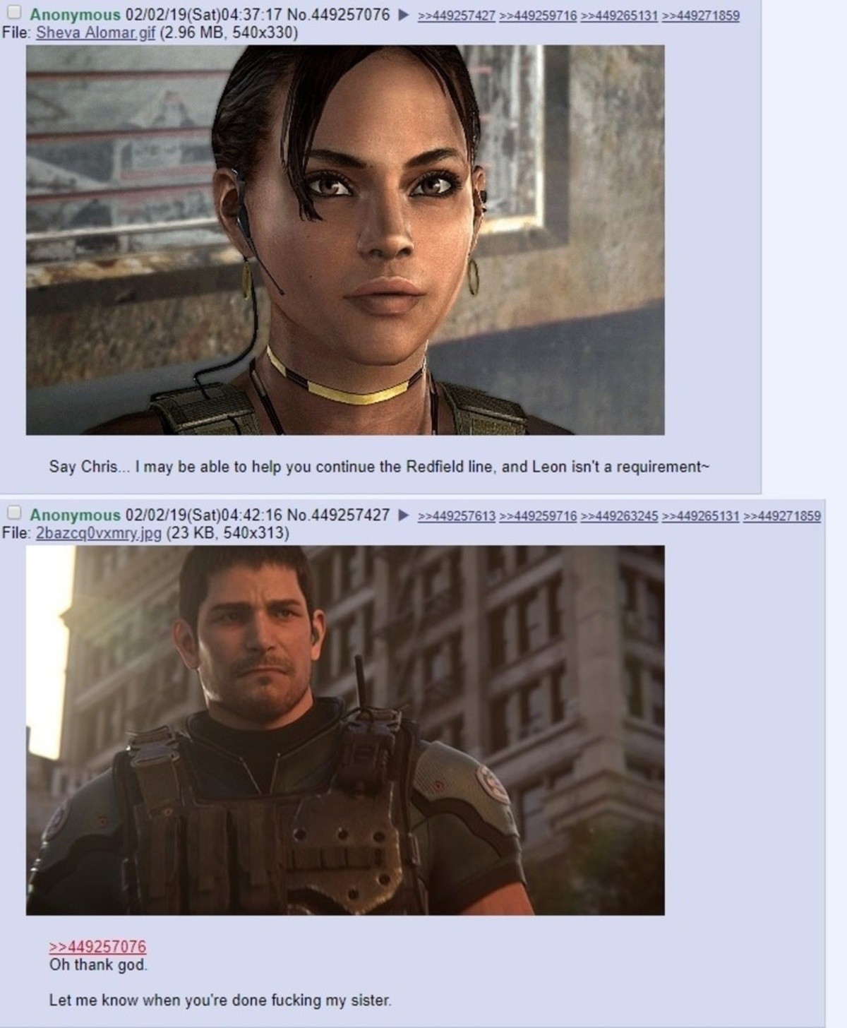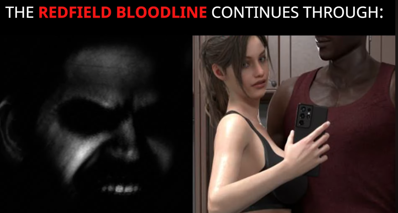 >>733674753I never got this meme,why doesn't Chris just have kids? Can't he spread the Redfield bloodline himself