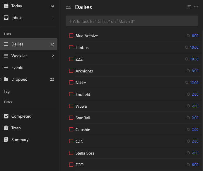 I lost my job and since then I fell into a gacha rabbithole, I play all of these now, I'm mentally ill and need help.I had to get an app to keep track of my dailies...