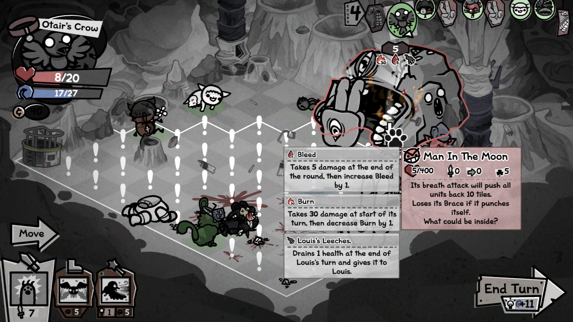 The druid has gone mad with power after his sparkles killed a leech and is now soloing the Moonman by making him beat the shit out of himself with his song that I upgraded to hurt enemies