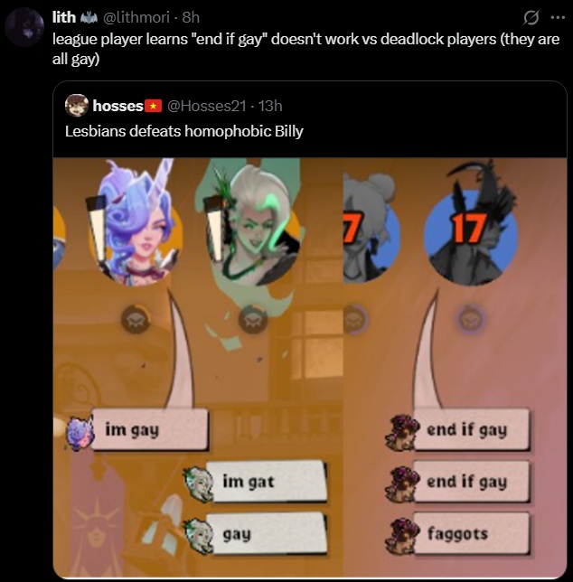 >>733737815>play match>guy talks in chat with gay accent>say he sounds gay>he rages out and malds for the rest of the match, literally screaming at me the entire timekek