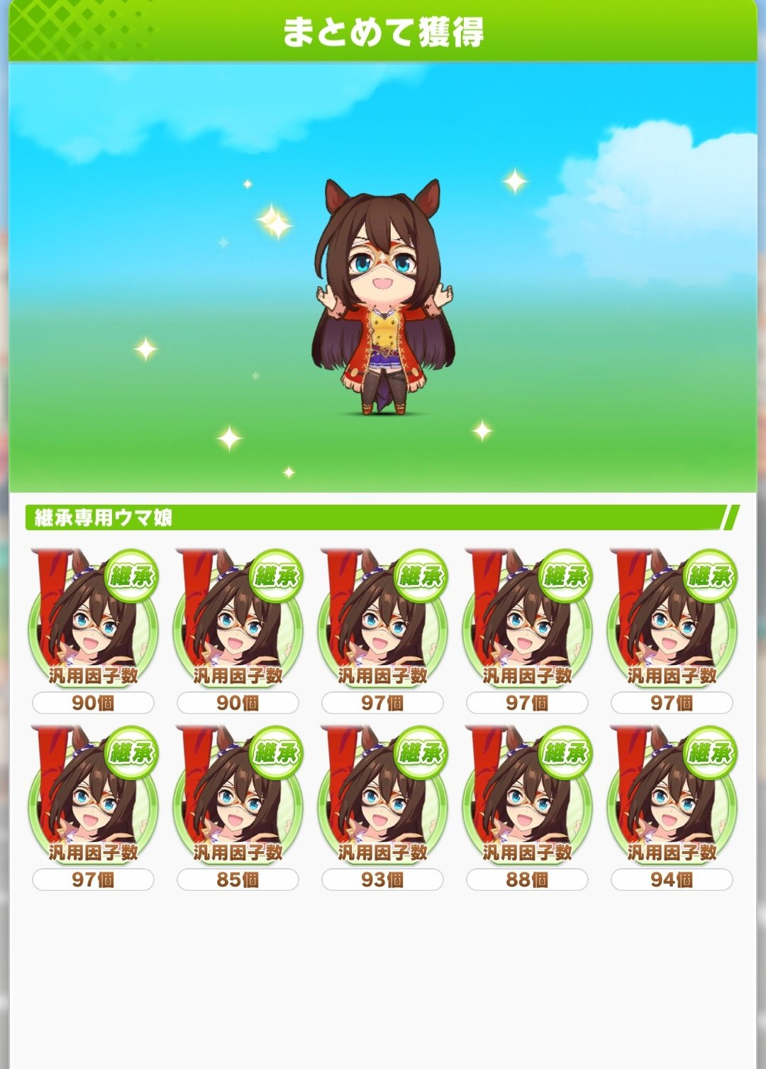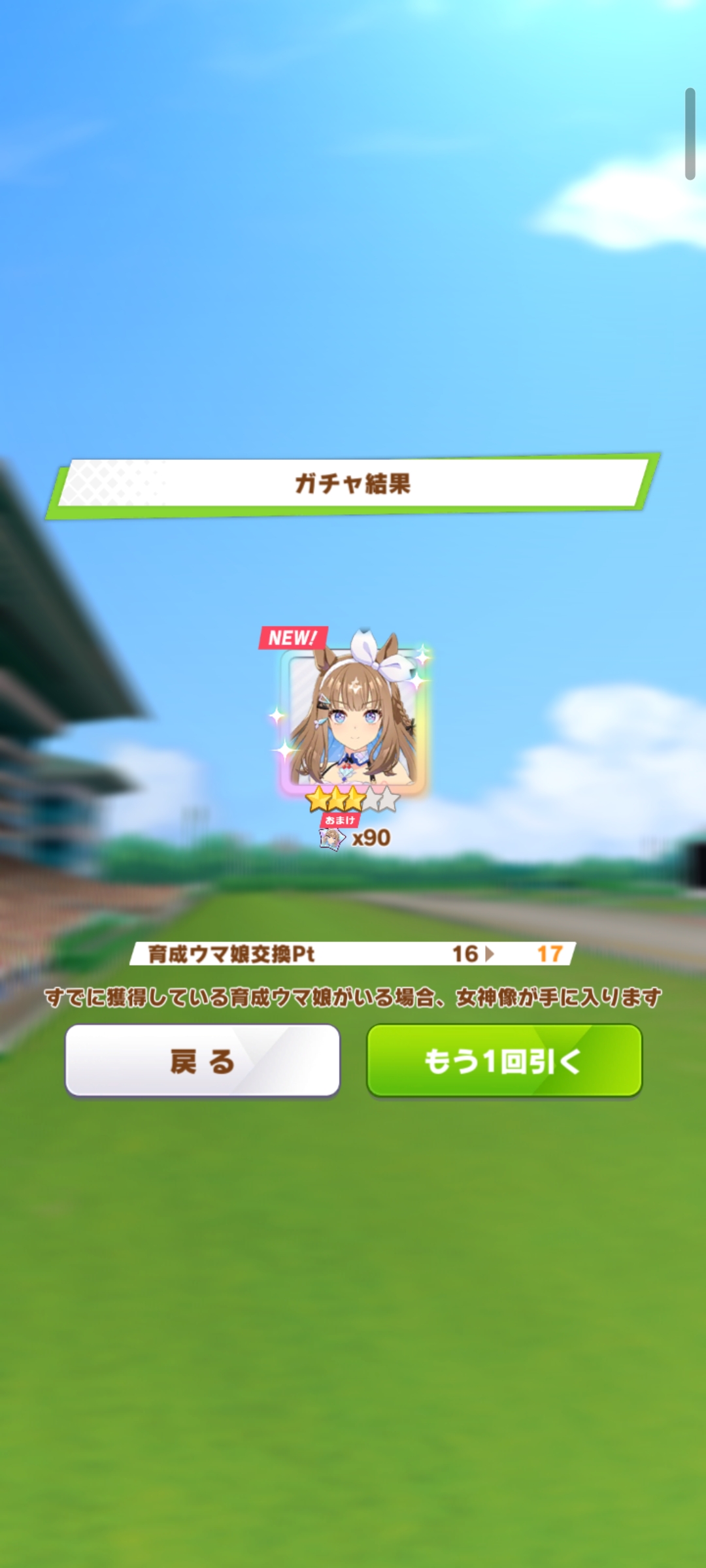 >had to pity spark Almond Eye>only got three new other umas and they're all alternative costumes (Samurai Grass Wonder, Onsen Wonder Acute, Christmas Daiwa Scarlet) of Umas I have beforeThis is giving me Verxina vibes in shit tier luck I got once