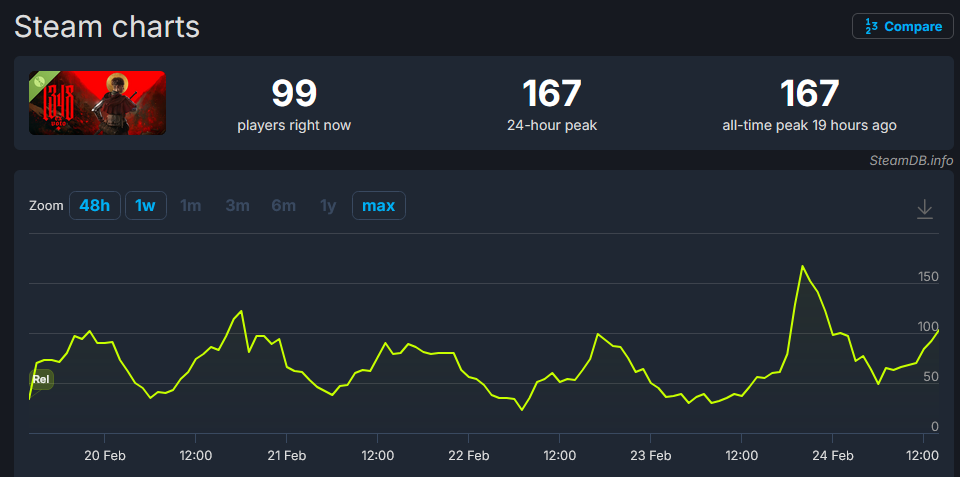 I predict 1348 will be the most sucessful woke game of the past few years with a player peak of 200 players, more than Dustborn and Relooted combined