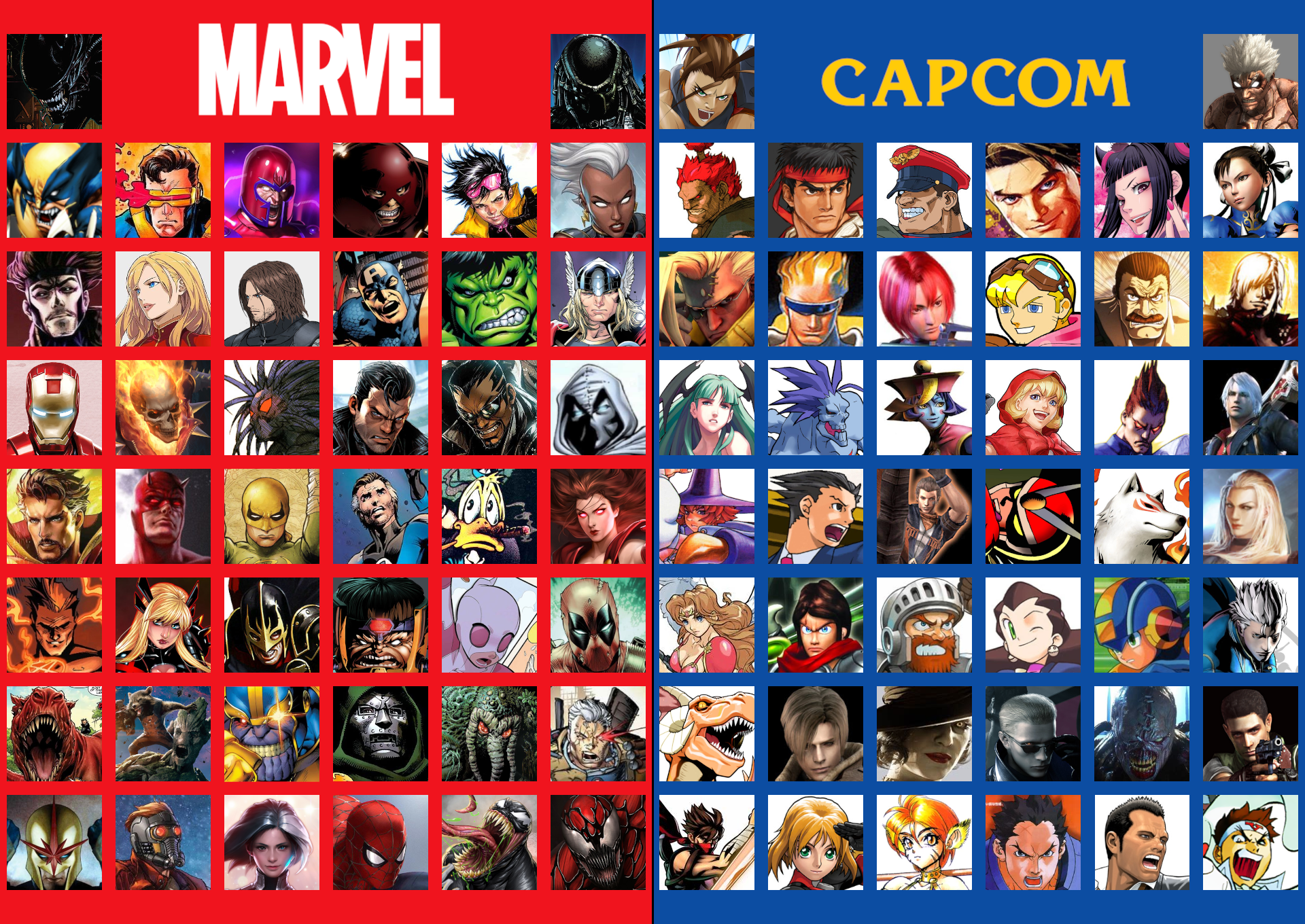 >>733713775i'm gonna rosterfag mvcvs>14 characters for eachMarvel>Storm>Sentinel>Doom>Magneto>Spider-Man>Hulk>Cable>Magik>Luke Cage>Daredevil>Moon Knight>Gwenpool>Scarlet Witch>Doc OckCapcom>Ryu>Ken>Chun-Li>Mega Man>Leon Kennedy>Dante>Monster Hunter>Guts Man>Lady Dimitrescu>Morrigan>Dmitri>Miles Edgeweorth>Masamune Date (Sengoku Basara)>ReginaSNK>Kyo Kusanagi>Iori Yagami>Terry Bogard>Geese Howard>Haohmaru>Nakoruru>Charlotte>Mudman>Kisarah Westfield>Fiolina Germi>Ryo Sakazaki>Robert Garcia>Mai Shiranui>Preecha