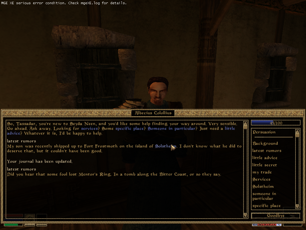 The thing that bugs me about Morrowind is all of the talking. I don't mind the gameplay, or lack thereof, since I loved Wurm which is effectively a multiplayer Morrowind, but I cannot get into dialogue-heavy games without my eyes rolling back into my head out of boredom.