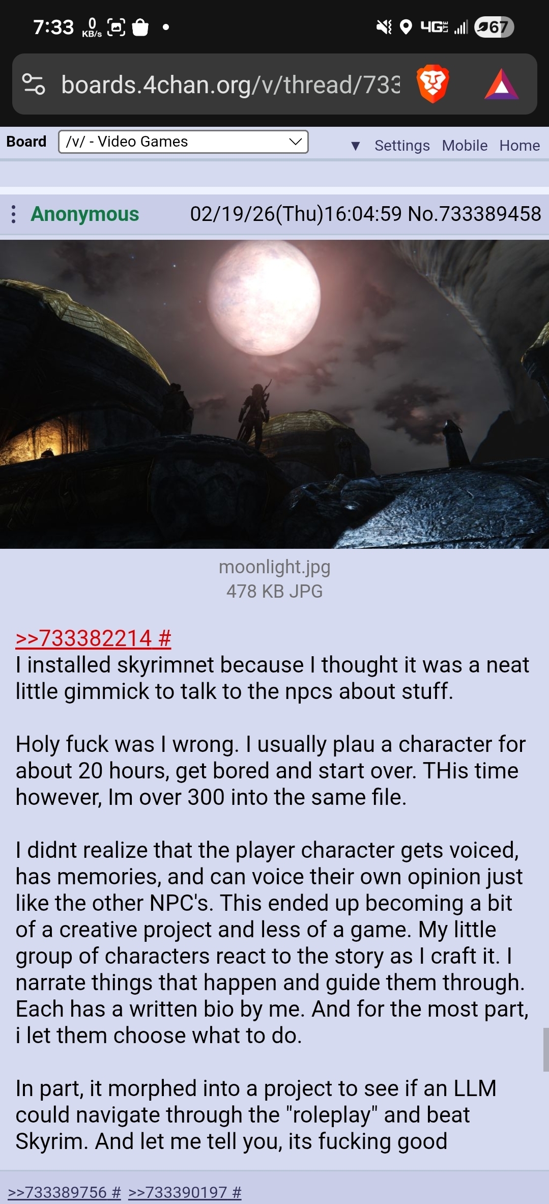 >>733715320This schizo anon is right btw. These LLM ai mods especially SkyrimNet which is still extremely early in development completely revolutionize the game. Its like having true realtime reactive dnd logic and role playing on top of skyrims game systems and sandbox. This is literally the future, and you'll enjoy it if you have imagination and inner monologue and aren't brown. Its relatively easy to setup too, but if you want decent TTS you need a decent gpu to run cuda natively on your hardware. I hooked SkyrimNet into LoreRim with no problems and have a college of winter hold student playthrough as a racist but lawful good Altmer female. Only gripe is ai isn't free (its still cents on the dollar per every couple hours) and you need an API system to manage and prompt all the ai models that control the game masters in real time. Everything is lore friendly and the ai comes prepackaged with the history of the game. I say try it, its still early but cool as fuck